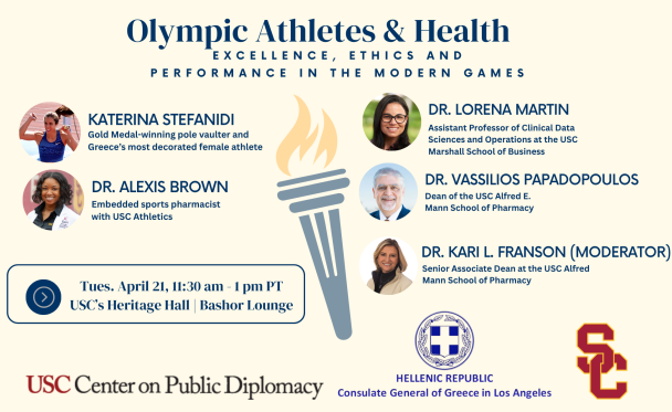Grounded in the enduring Olympic values of excellence, respect, fairness, and human development, the program invites reflection on how modern science, ethical leadership, and athlete advocacy can strengthen communities locally and globally as the world turns its attention to the 2028 Games. The event continues the Olympic Ideals Series, co-hosted by the USC Center on Public Diplomacy and the Consulate General of Greece in Los Angeles.